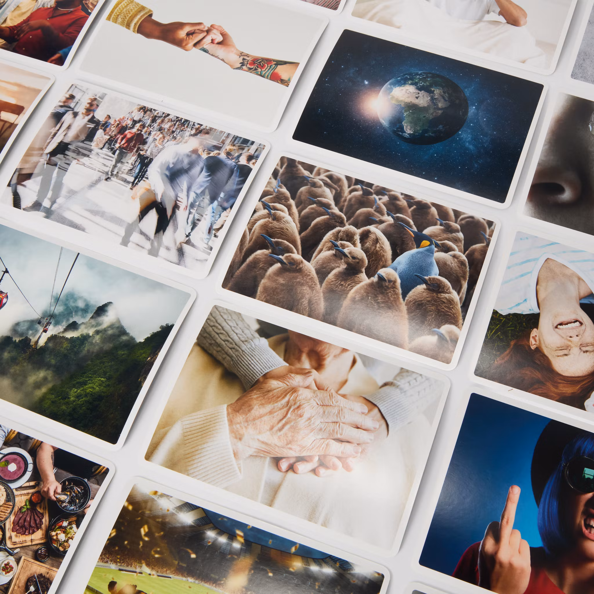 Denna ask innehåller 50 helt nya kort med nya motiv som kan användas för att sätta ord på känslor, tankar, behov, idéer med mera. De kan till exempel användas vid uppstarten av ett möte genom att deltagarna får välja ett kort som symboliserar deras förväntningar på mötet eller för att presentera sig. De kan också användas för att utvärdera ett möte, en idé eller en aktivitet. Här hittar du fler kreativa idéer på hur du kan använda korten www.resultatbolaget.se/fotokorten